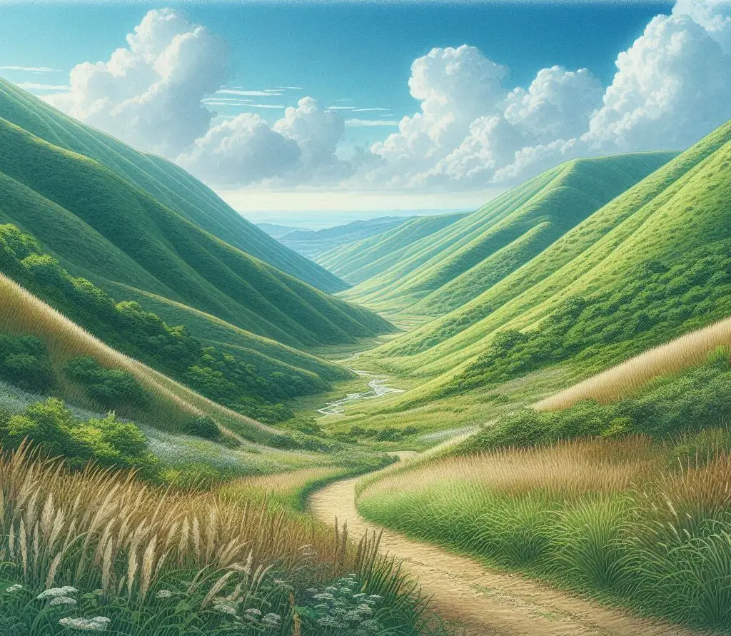 Après avoir quitté les ruines de Féagil, le paysage est le même, des collines constituées d'herbes grasses, quelques arbres mais, globalement, une végétation basse.