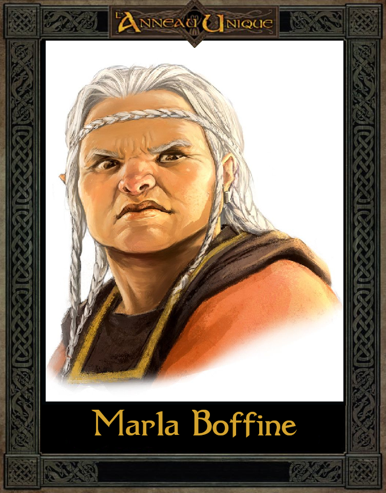 - "Comment ça, je commence ?? Est-ce que c'est de ma faute si ma femme vient se promener par ici et puis a pris l'initiative de venir..." puis il se tourne vers sa femme : "Mais, Marla !! Quand même !!" puis se tourne, de nouveau, vers les compagnons et leur dit : "Je vous rappelle que j'ai, quand même, été désigné le Thain parmi les Hobbits du parc ! Et qu'il était convenu que je puisse aller négocier par la suite les voyages par la Comté. Enfin... mais... Et vous voulez me laisser là, sur le bord du chemin ?? A peine quelques heures après que l'on soit parti !!" lance Perin Boffine.