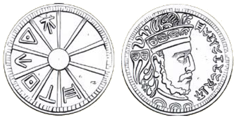 Une pièce d'or parfaitement ronde pesant environ 0,36 once troy. Devant : Le Soleil avec dix rayons disposés pour ressembler à une roue. Verso : Un portrait idéalisé de l'empereur Dieu de Dara Happa.
