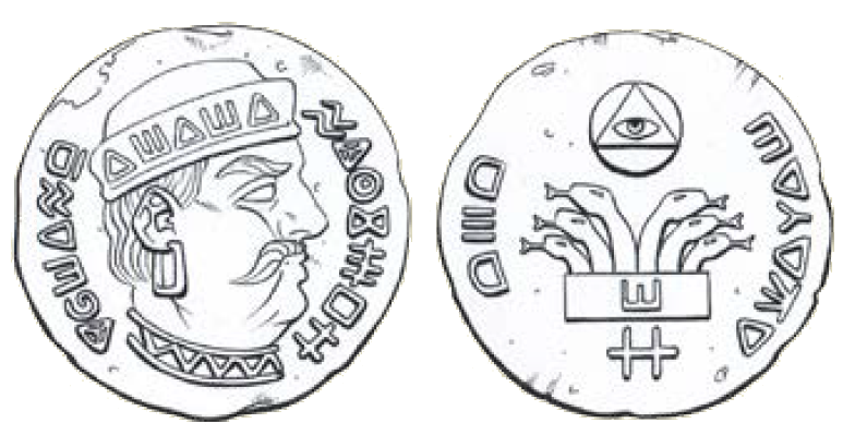 Une pièce d'argent pesant environ 0,2 once troy. Devant : Portrait idéalisé du roi Guilmarn le Gros. Verso : La couronne de serpent de Seshnela soutient l'œil omniscient du Dieu invisible.