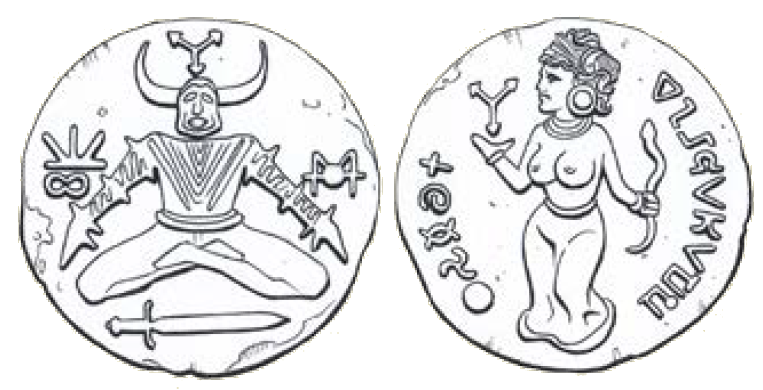 Petite pièce d'argent pesant environ 0,07 once troy. Recto : représentation du Grand Arkat. Verso : Erengazor de Tortun, suzerain de Sentanos.