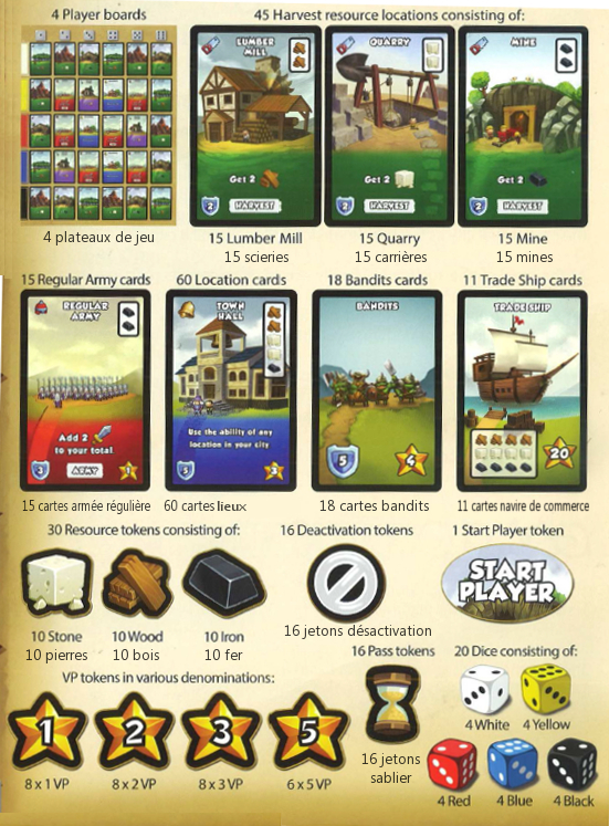 Faites 3 piles de jetons ressources (bois, pierre et fer) accessibles aux joueurs. Placez les jetons PV à proximité pour former une réserve. Faites des piles séparées des jetons sablier et des jetons désactivation.