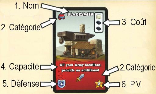 La couleur en bas de la carte et le symbole en haut à gauche déterminent la catégorie du lieu. Les lieux sont classés en 5 catégories différentes : ressources (vert), militaires (rouge), économiques (jaune), culturelles (violet) et civiles (bleu).