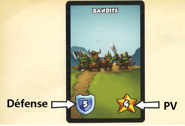Le nombre dans le bouclier représente la défense des bandits. Pour attaquer un bandit, les joueurs ont besoin d'une Force Armée égale ou supérieure à la défense. Dans ce cas, le joueur victorieux pioche la carte et la pose face cachée avec ses autres PV.
