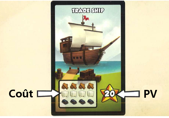 Pendant cette étape, vous pouvez aussi utiliser les bateaux de commerce pour exporter des marchandises et gagner des PV. Choisissez un navire et dépensez les ressources selon le coût du bateau. Les ressources dépensées retournent dans leur pile. Ensuite prenez la carte navire de commerce et placez-la face cachée devant vous. Par exemple, si vous exportez dese marchandises sur un bateau qui nécessite 2 bois, 2 pierres et 2 fers, vous gagnerez 5 PV avec cette carte. Si toutes les cartes bateaux de commerce ont été prises, les joueurs ne peuvent plus utiliser ces bateaux de commerce.