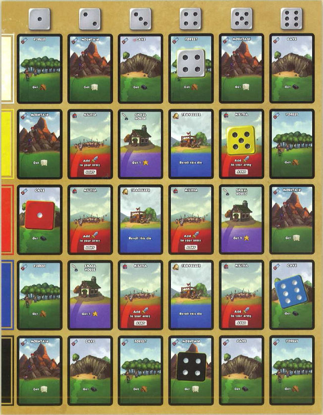 Chaque joueur prend un plateau de jeu et un ensemble de 5 dés de chaque couleur (1 blanc, 1 jaune, 1 rouge, 1 bleu et 1 noir). Les plateaux et dés non utilisés sont remis dans la boîte.