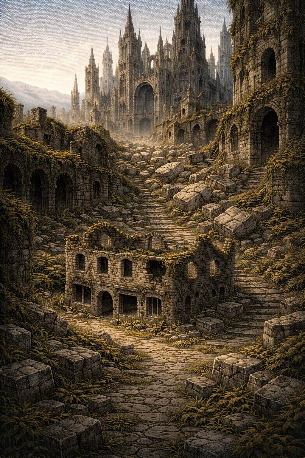 L'accès à la ville haute est assez difficile d'accès. Les escaliers ont été détruit ou recouverts par la végétation. Les compagnons vont devoir escaler certaines parois pour y accéder. Ils ne peuvent donc continuer avec les chevaux. Fánaviryan indique :