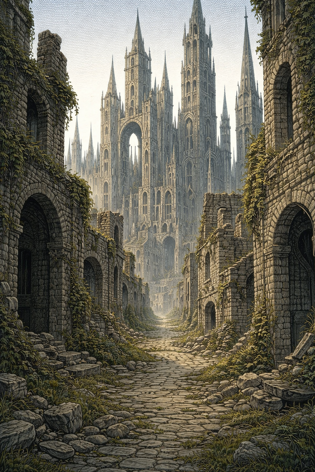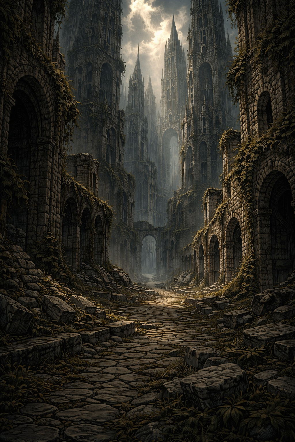 Daëgon et Fron ont leur arc à la main. Fánaviryan progresse avec les deux mains de libre et Tirash l'épée dans une main. L'atmosphère est pesante dans la ruelle. Aucun son ne vient troubler les bruits de pas des compagnons. Les hautes tours réduisent la lumière du jour. Certaines tours sont partiellement détruites et de nombreux gravas sont au sol. Les compagnons doivent, donc, être vigilants à chaque pas pour ne pas chuter sur une pierre.