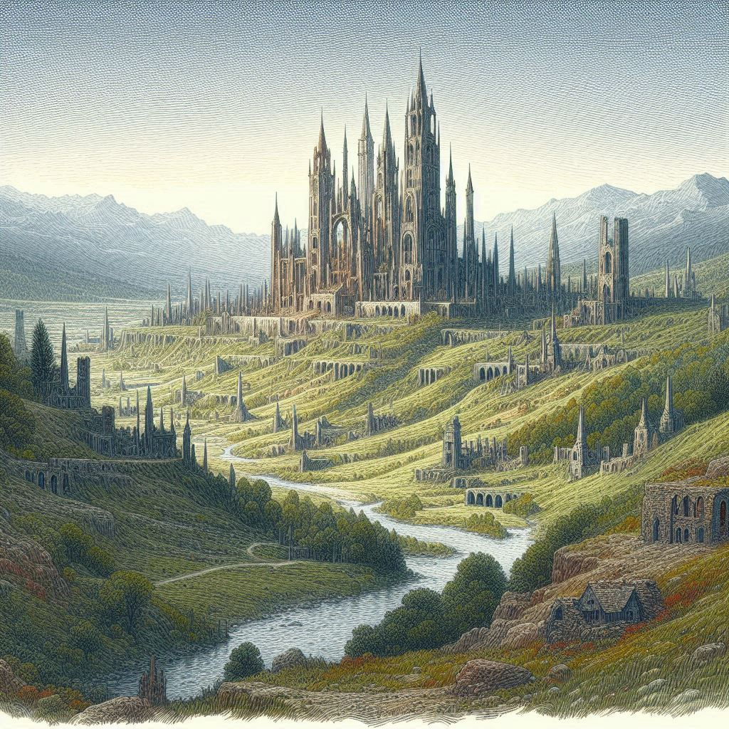 Les compagnons reprennent leur progression. Ils vont descendre la colline, laissant, derrière eux, l'arbre du guetteur. Lorsqu'ils sont dans la vallée, ils vont remarquer une ancienne route qui a été envahie par la végétation. Les ronces et plantes sauvages ont effacé les traces des anciennes civilisations ayant prospérées par le passé.