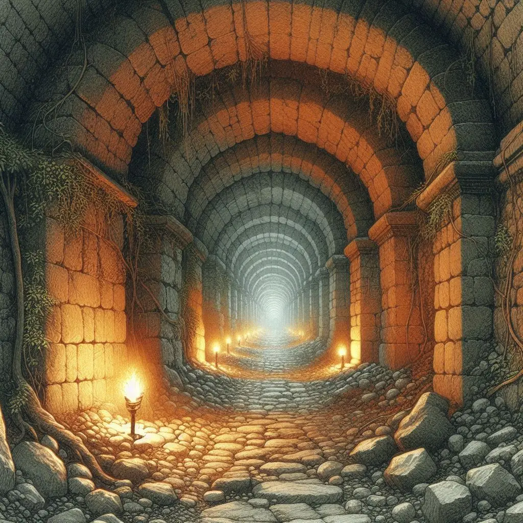 Les compagnons vont progresser pendant plusieurs minutes dans le même environnement. Plusieurs embranchements vont apparaitre, à plusieurs reprises, sur leur droite et sur leur gauche. Le réseau de galeries semble important sous la surface de la ville.
