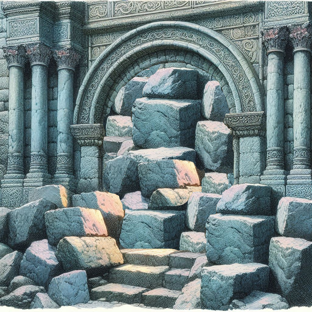 Daëgon, Fron et Tirash se mettent de chaque côté pour couvrir l'Elfe puis celle-ci grimpe sur les pierres avec une grande facilité et accède rapidement en haut de l'arche. Fánaviryan se retrouve dans une bonne position pour pousser sur la pierre qui se révèle être assez légère et la glisse sur le côté avec beaucoup plus de force que nécessaire. Sans doute que la pierre pourrait être remise en place assez aisément.