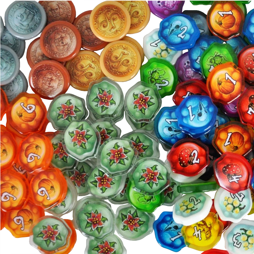 Le set de jetons GeekUp de l'extension des "Charlatans de Belcastel" : les "Sorcières s'en mêlent" comprend 169 jetons d'ingrédients de forme personnalisée (tous d'une épaisseur de 4 mm) et répartis de la même manière que les pièces d'origine en carton de l'extension.